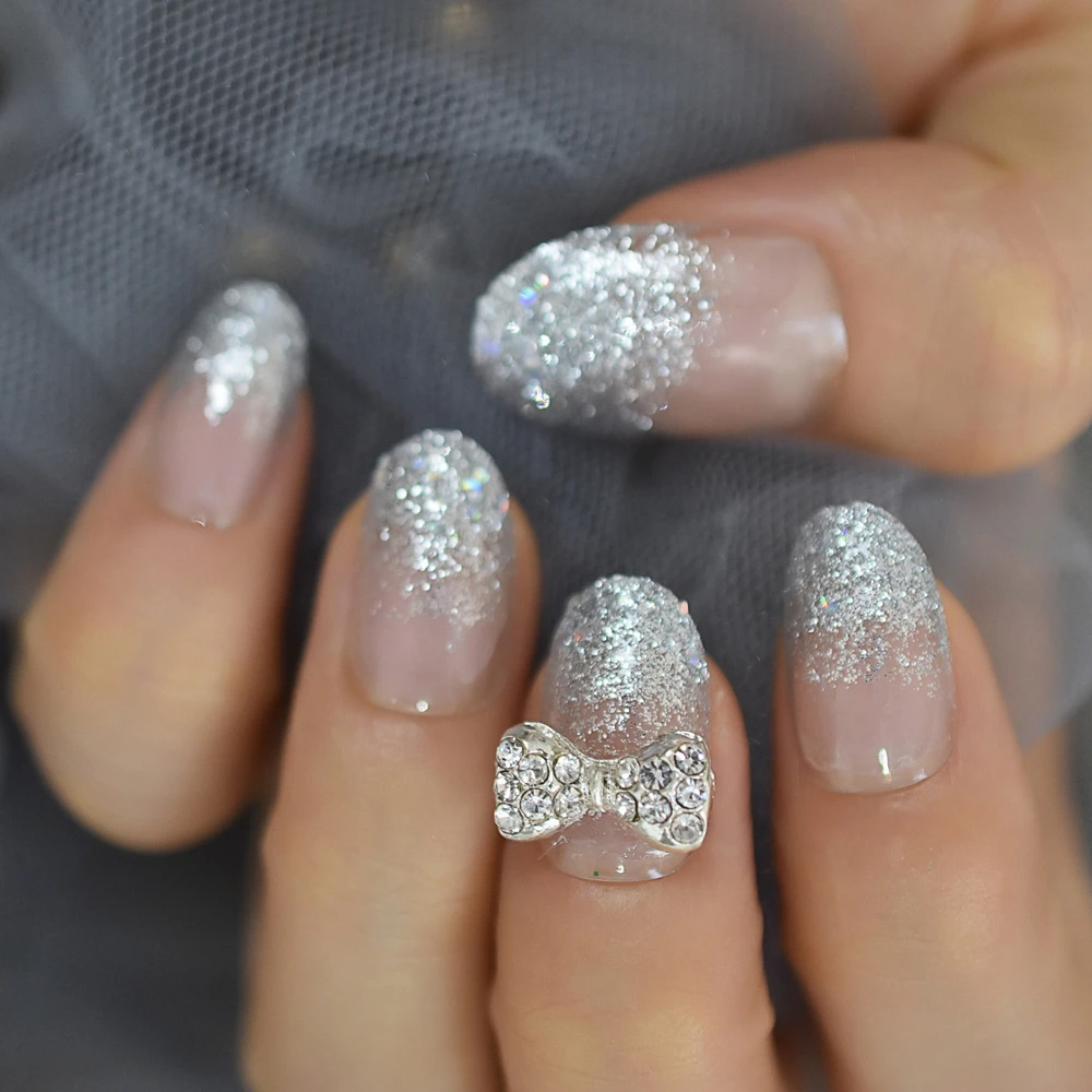 Uv Gelnails Oval Short Press On Nails Hand Painted Silver Glitter